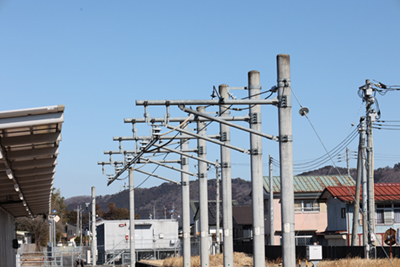 ![]() ホーム上には充電するための架線が設置されています。 |