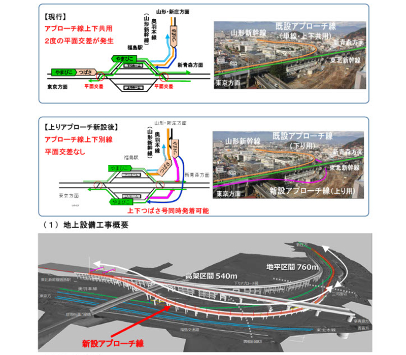 | 現在、福島駅は11・12番線が東京方面の上り、13・14番線が山形・仙台方面の下りの4つからなっています。 そして、山形新幹線の上り・下りは14番線のみで対応しています。 14番線のみで対応するためには、本数の増発(1時間に3本が限界)は難しく、また仙台からやってくる東京方面の上り列車に連結するためには、ほかの東北新幹線の線路と平面交差しなけらばならず、どちらかが遅れてしまうと、東北新幹線のダイヤに影響が出る可能性があります。 そこで、11番線側にあらたにアプローチ線を増設することで、平面交差を解消するとともに、繁忙を極める14番線の解消を目指しています。 2021年7月の本体工事が着工し、2026年度末(2027年3月)供用開始の予定となっています。 |