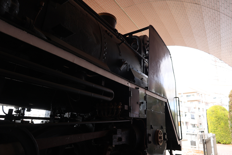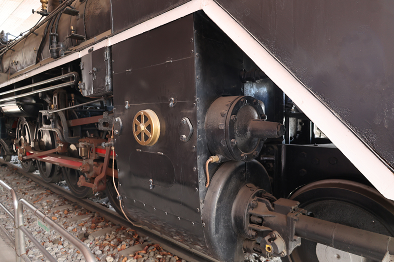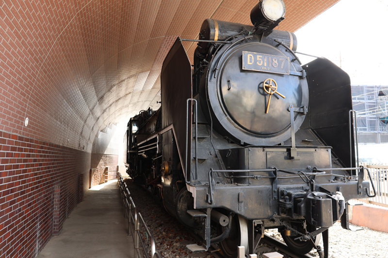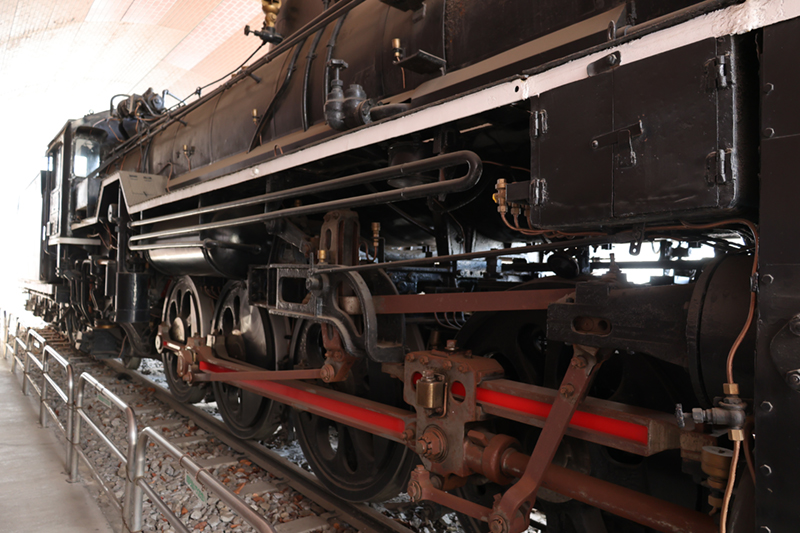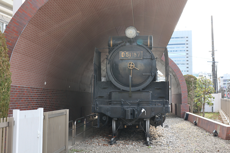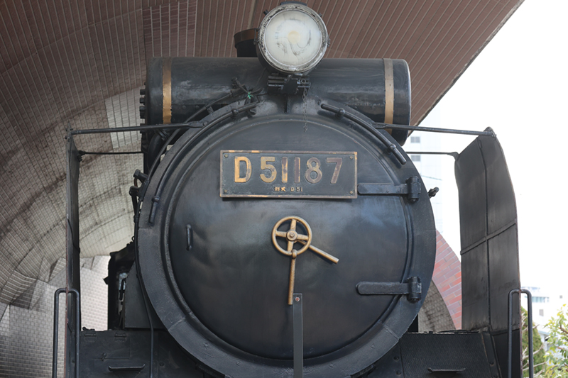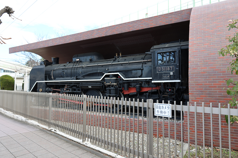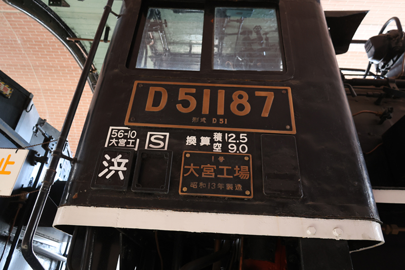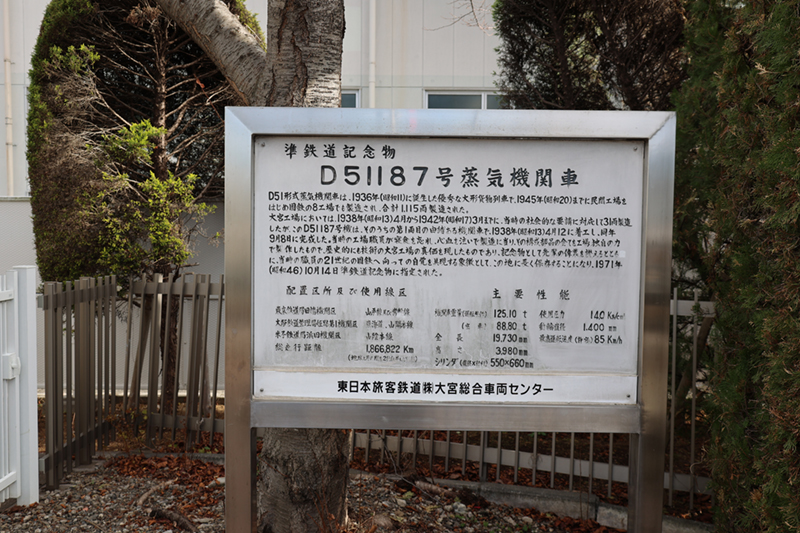 | D51形蒸気機関車 D51形蒸気機関車は、日本国有鉄道(国鉄)の前身である鉄道省が設計製造した、単式2気筒で過熱式のテンダー式蒸気機関車である。主に貨物輸送のために用いられ、太平洋戦争中に大量生産されたこともあって、その所属両数は総数1,115両に達しており、ディーゼル機関車や電気機関車などを含めた日本の機関車1形式の両数では最大を記録した。 「デゴイチ」(「デコイチ」とも)の愛称は有名で、日本の蒸気機関車の代名詞にもなった。 諸データ(D51 101以降の標準型) 全長 19,730mm 全高 3,980mm 軌間 1,067mm 車輪配置 2-8-2(1D1) - ミカド 動輪直径 1400mm シリンダー(直径×行程) 550mm×660mm ボイラー圧力 15kg/cm2 火格子面積 3.27m2 全伝熱面積 168.8m2 付熱全面積 221.5m2 過熱伝熱面積 41.4m2 ボイラー水容量 6.0m3 機関車運転重量 78.37t 動輪軸重(最大) 14.30t 炭水車重量 47.40t 機関車性能: 動輪周馬力 1,280PS 現地案内板より D51形蒸気機関車は、1936年(昭和11)に誕生した優秀な大形貨物列車で、1945年(昭和20)までに民間工場をはじめ国鉄の8工場でも製造され、合計1,115両製造された。 大宮工場においては、1938年(昭和13)4月から1942年(昭和17)3月までに、当時の社会的な要請に対応して31両製造したが、このD51187号機は、そのうちの第1両目の由緒ある機関車で、1938年(昭和13)4月12に着工し、同年9月8日に完成した。当時の工場職員が寝食を忘れ、心血を注いで製造に当たり、その構成部品すべてを工場独自の力で製作したもので、歴史的にも技術の大宮工場の真価を現したものであり、記念物として先輩の偉業をたたえるとともに、当時の職員の21世紀の国鉄に向かっての自覚を具現する象徴として、この地に長く保存することになり、1971年(昭和46)10月14日準国鉄記念物に指定された。 配置区所及び使用線区 東京鉄道局田端機関区 山手線及び常磐線 大阪鉄道管理局姫路第1機関区 東海道、山陽本線 米子鉄道局浜田機関区 山陰本線 総走行距離 1,866,822km(地球と月の間を2往復半した距離) 主要性能 機関車重量(運転整備) 125.10t (空車) 88.80t 全長 19.730mm 高さ 3,980mm シリンダ(直径×行程) 550×660mm 使用圧力 14.0kg/cm2 動輪直径 1,400mm 最高運転速度(許容) 85km/h |
